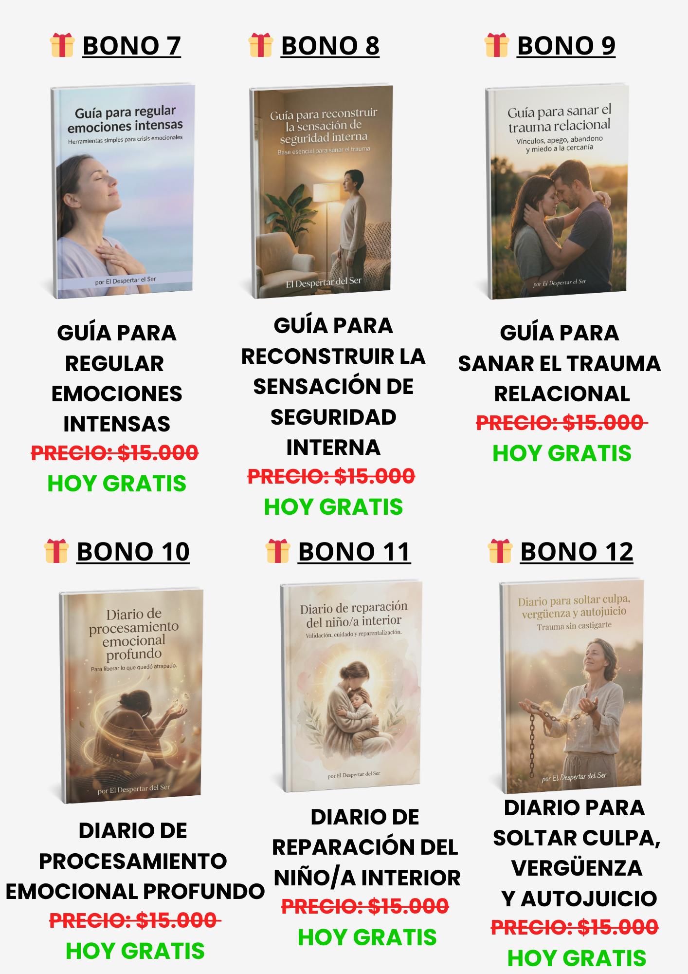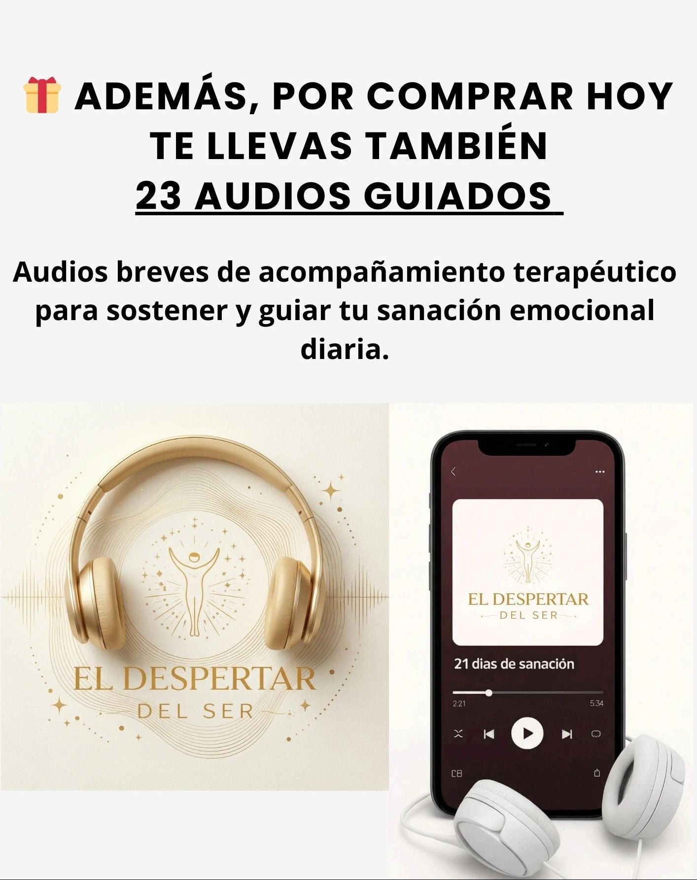 El valor es de $44.000 pesos argentinos. Incluye el libro digital "El Proceso de Sanar desde Adentro", 80 ejercicios prácticos para transitar el trauma + 18 Ebooks de Regalo + 23 Audios guiados.
